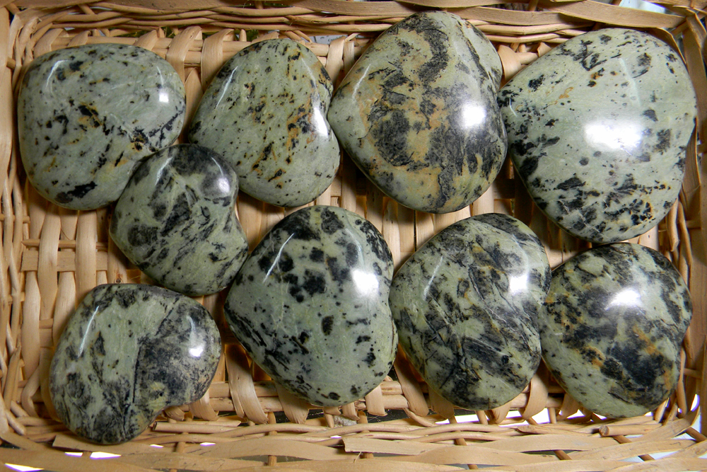 Dragon Jade hearts, and palm stones in Black Tourmaline, “Ruby” Garnet and Lepidolite are also new additions: